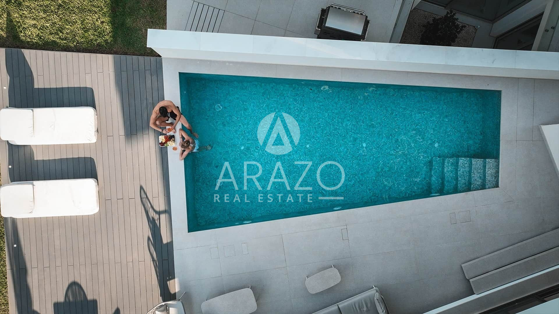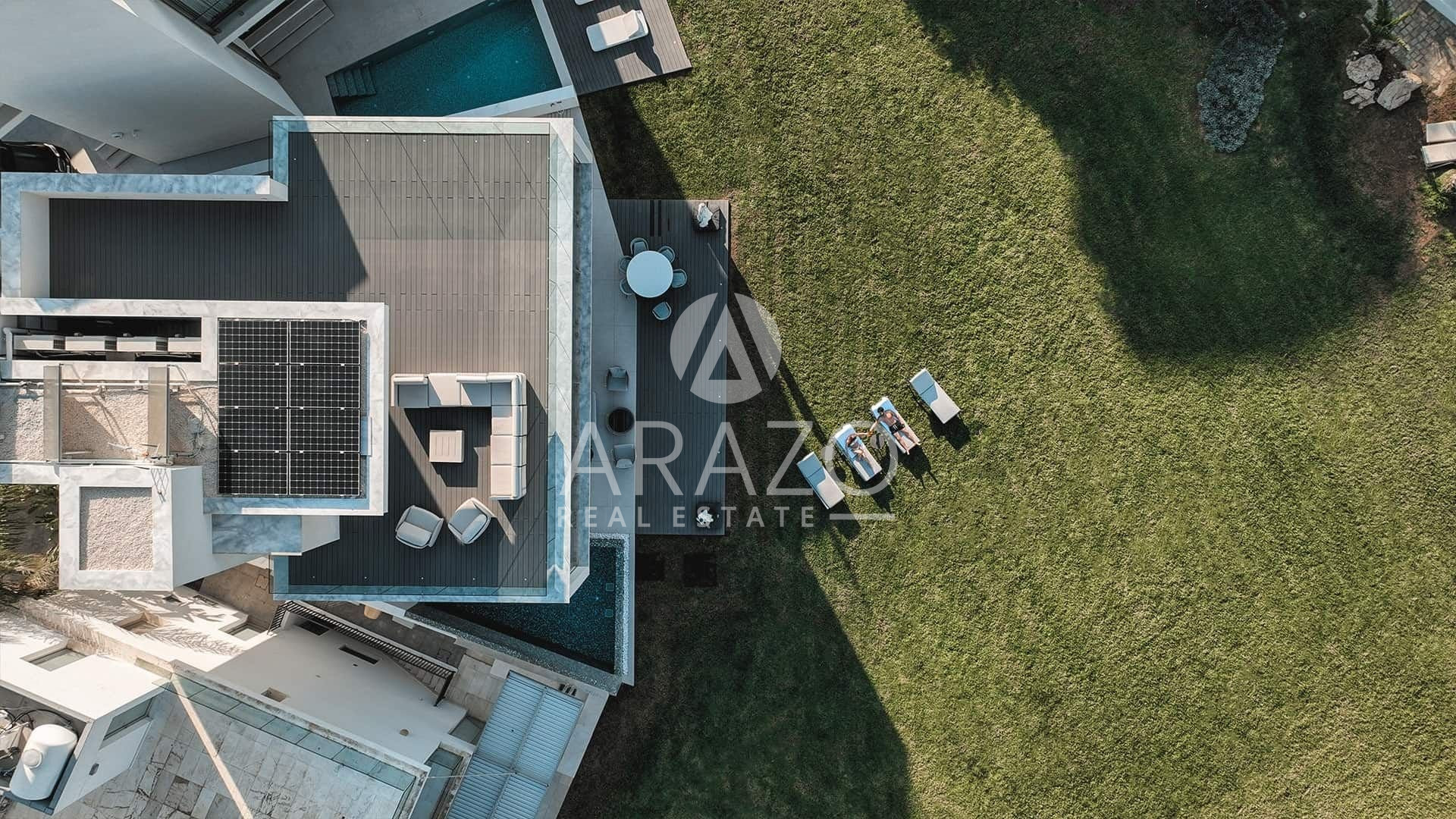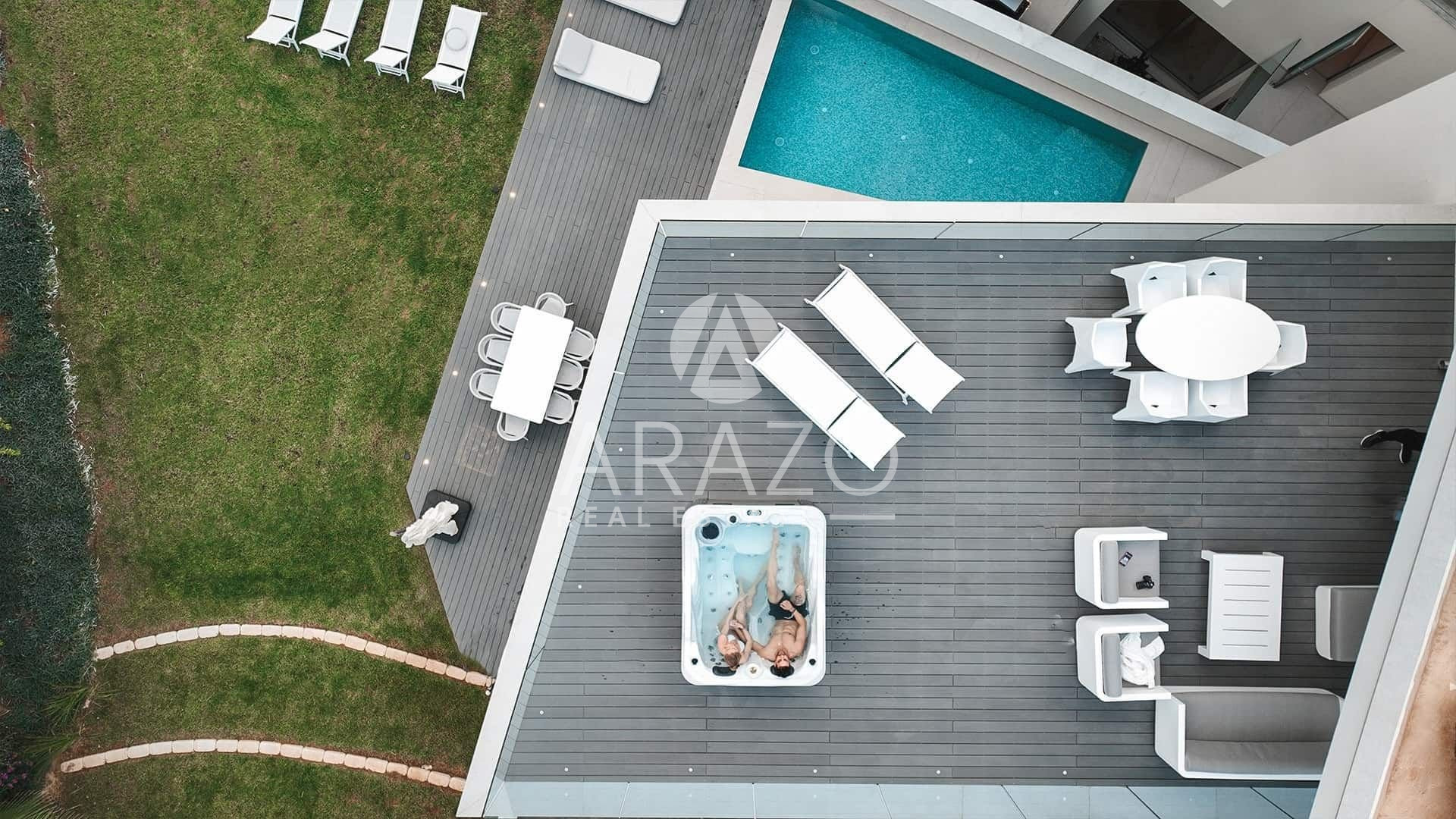 The outdoor area 92sqm includes a swimming pool 7.70*3.2m, a deck area with 6 sunbeds a dining area and a lounge area.