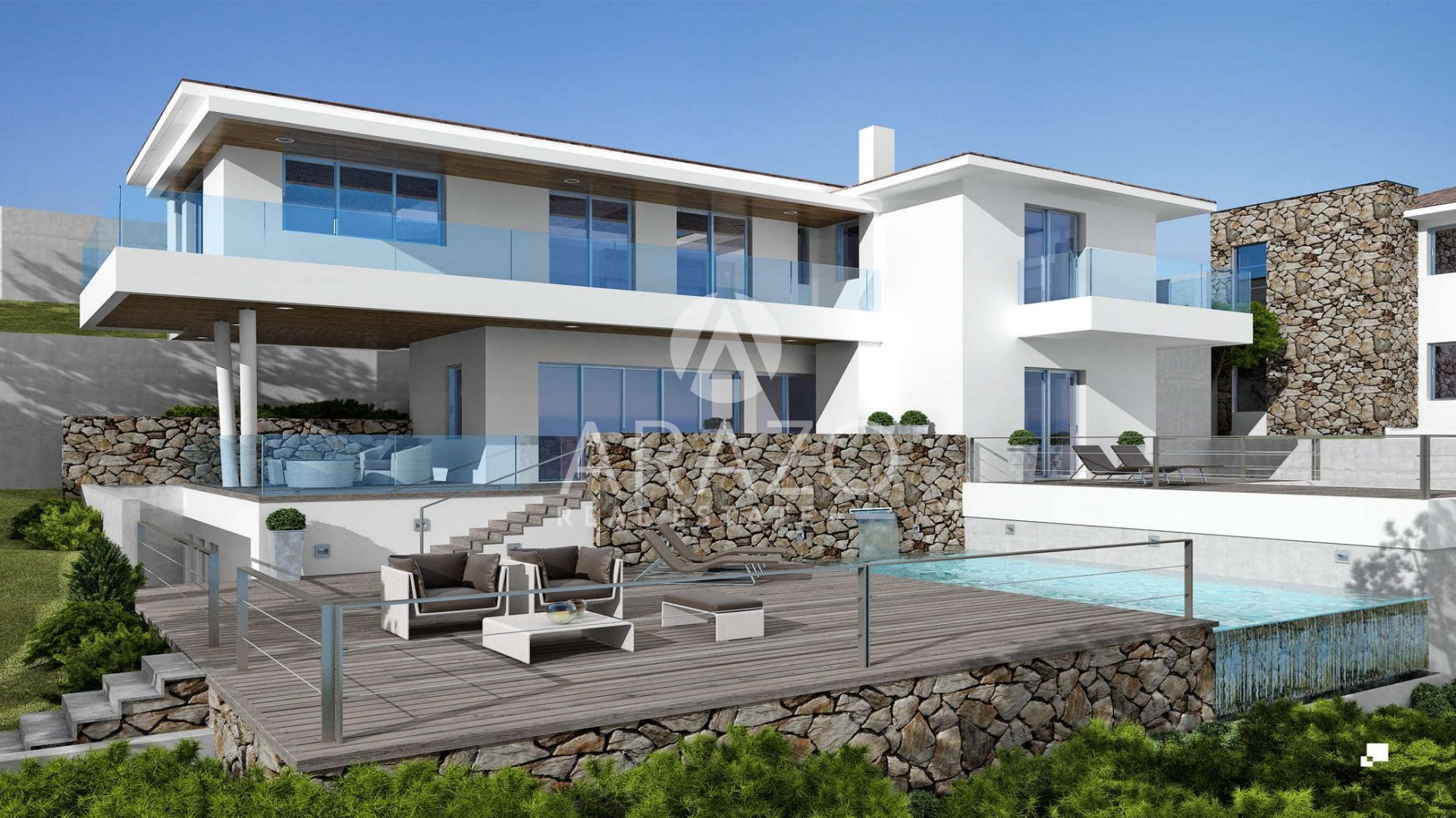 The architecture of the villas copies the outline of the plots themselves thus pointing out the uniqueness of the project. Interior and exterior areas run into one another as well as into the magnificent views, blending with each other, architectural landscapes and volumes. None of the houses look alike. The architectural sleek design of the villas conveys the location relevance of each of them. Swimming pools with infinity edge waterfall outline the spectacular sundecks and barbeque areas, which are carefully positioned to suit an array of entertainment and relaxing atmosphere. Comfort and privacy of your living are guaranteed even by the shape and location of the plots. For example, you may enter your villa through an intimate entry; take the elevator down to the living quarters and open up to a limitless view that shall embrace you along with the carefully selected landscaped garden and a sea-facing infinity swimming pool.