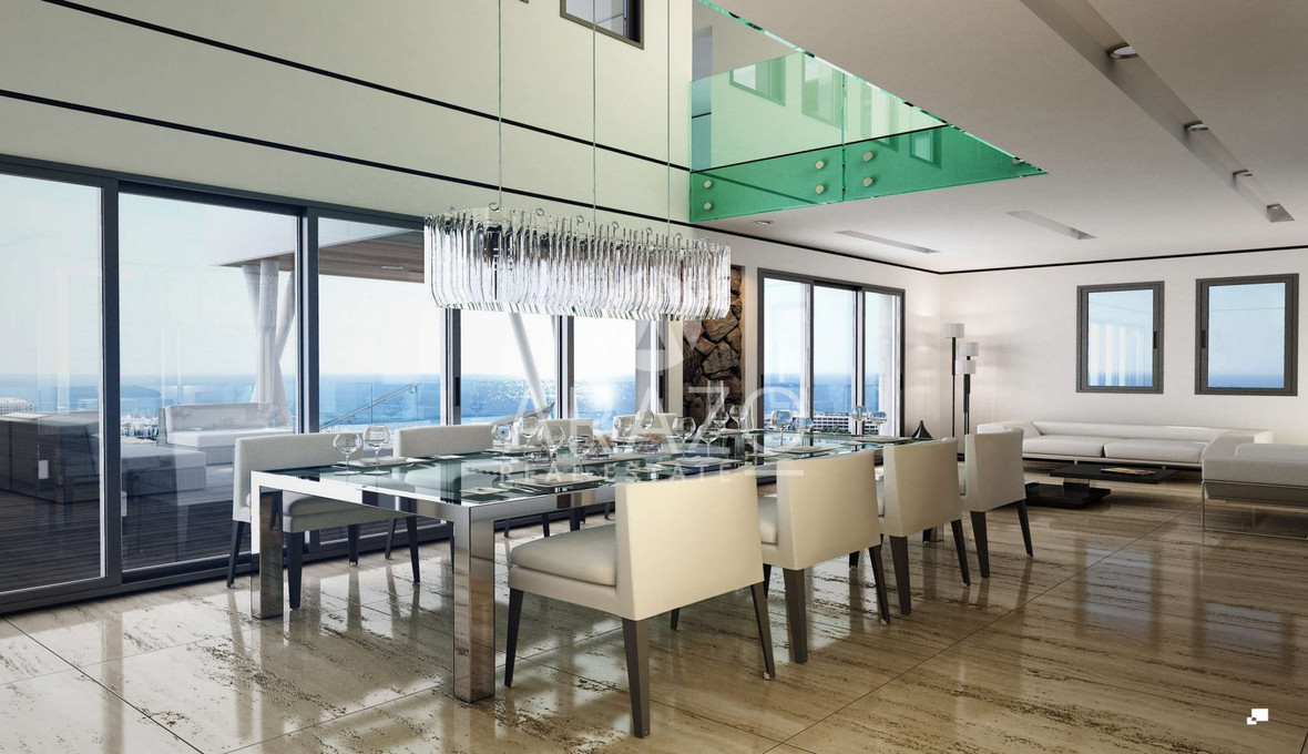 Fully glazed facade and double height ceilings capture the full transparency of villas, allowing the interiors to captivate the sun thus visually extending its areas. All rooms are designed so as to allow for the panoramic sea views from all the terraces. Every villa has a lower ground floor that may be used as a relaxation area. It merges amongst the large sun-deck areas of the infinity pool and landscaped gardens below allowing you to unwind whilst entering your home from the upper level whilst the sunshine filters down, escalating from the upper floors and creating an environment both soothing and composed.