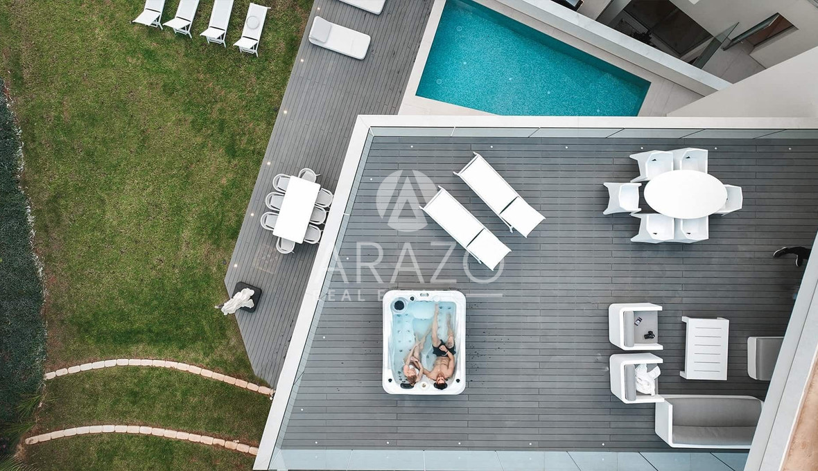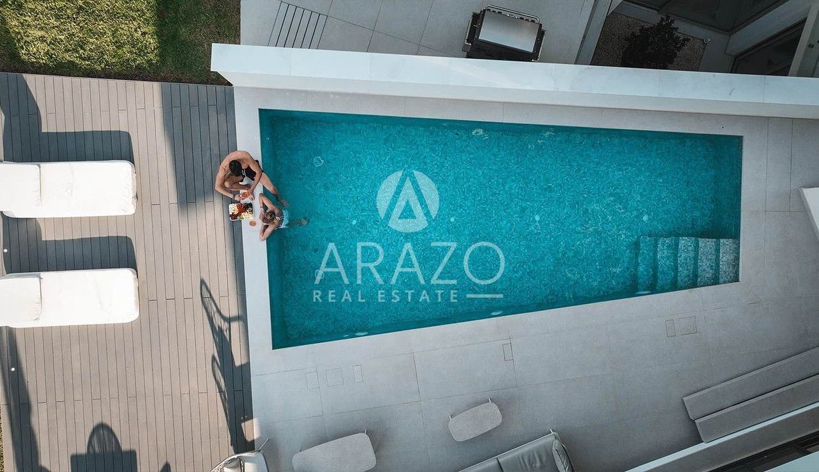 The outdoor area 92sqm includes a swimming pool 7.70*3.2m, a deck area with 6 sunbeds a dining area and a lounge area.