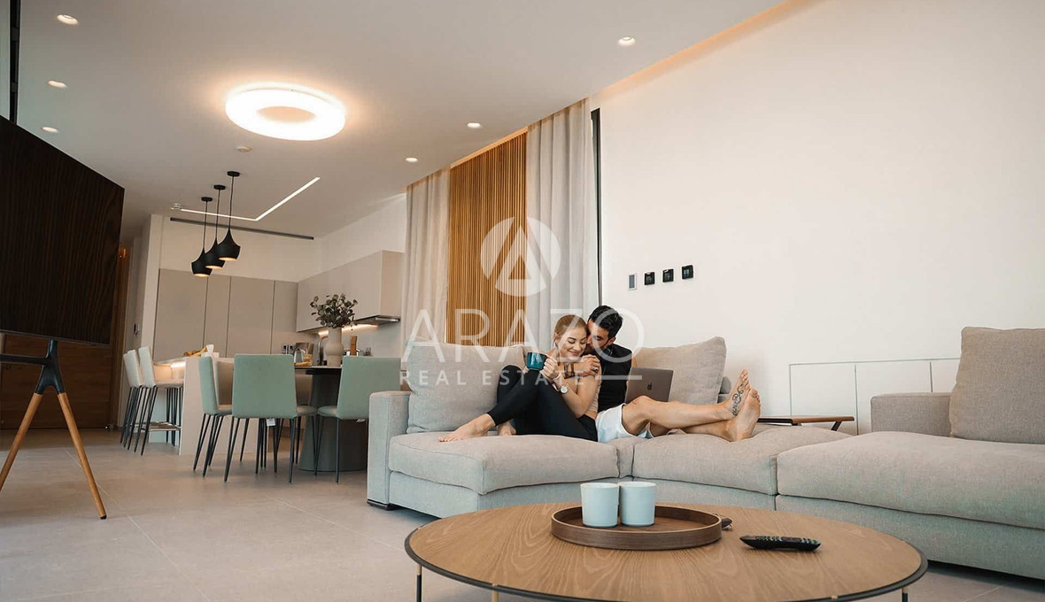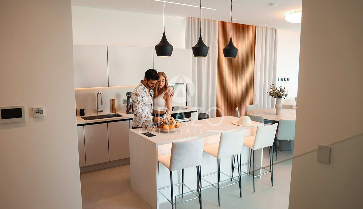 On the ground floor 82 sqm you can find the kitchen a 3 seater island, 8-seat dining table a living room area with a flat-screen tv and guest bathroom.